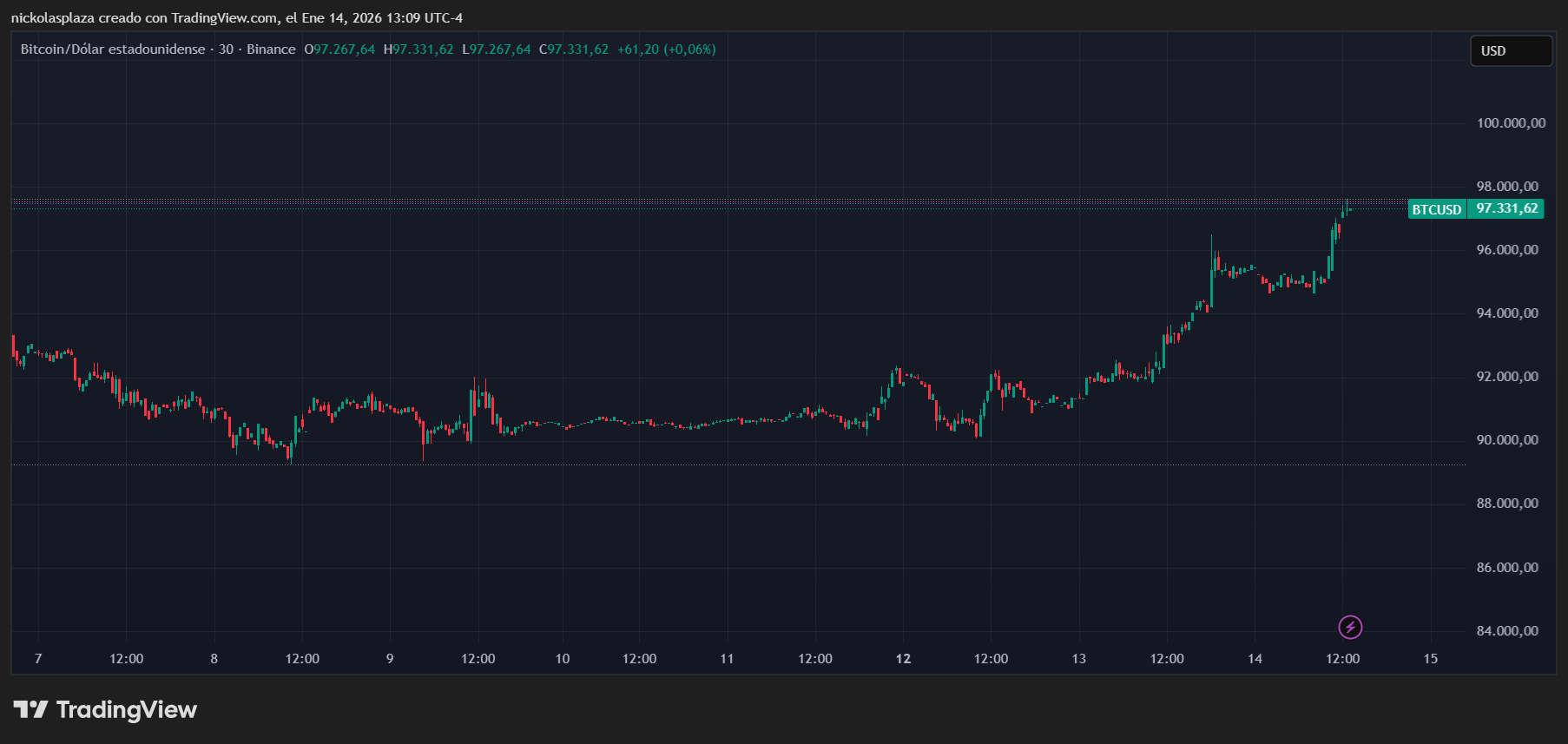 La moneda digital llegรณ a superar los 97.000 dรณlares hoy, lo que representa un aumento del 3,50% en las รบltimas 24 horas.