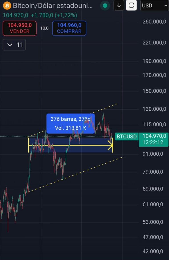 Durante los últimos 376 días bitcoin se ha mantenido oscilando entre una zona de soporte cercana a los 90.000 dólares y un techo alrededor de los 115.000 dólares, en promedio, confirmando el rango lateral descrito por Battaglia. La franja azul en el gráfico representa este nivel de consolidación prolongada.