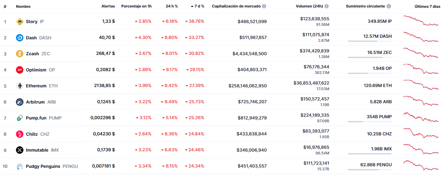 Y las altcoins se llevan la peor parte. El siguiente gráfico, provisto por CoinMarketCap, muestra las 10 criptomonedas y tokens con mayores caídas en la última semana: