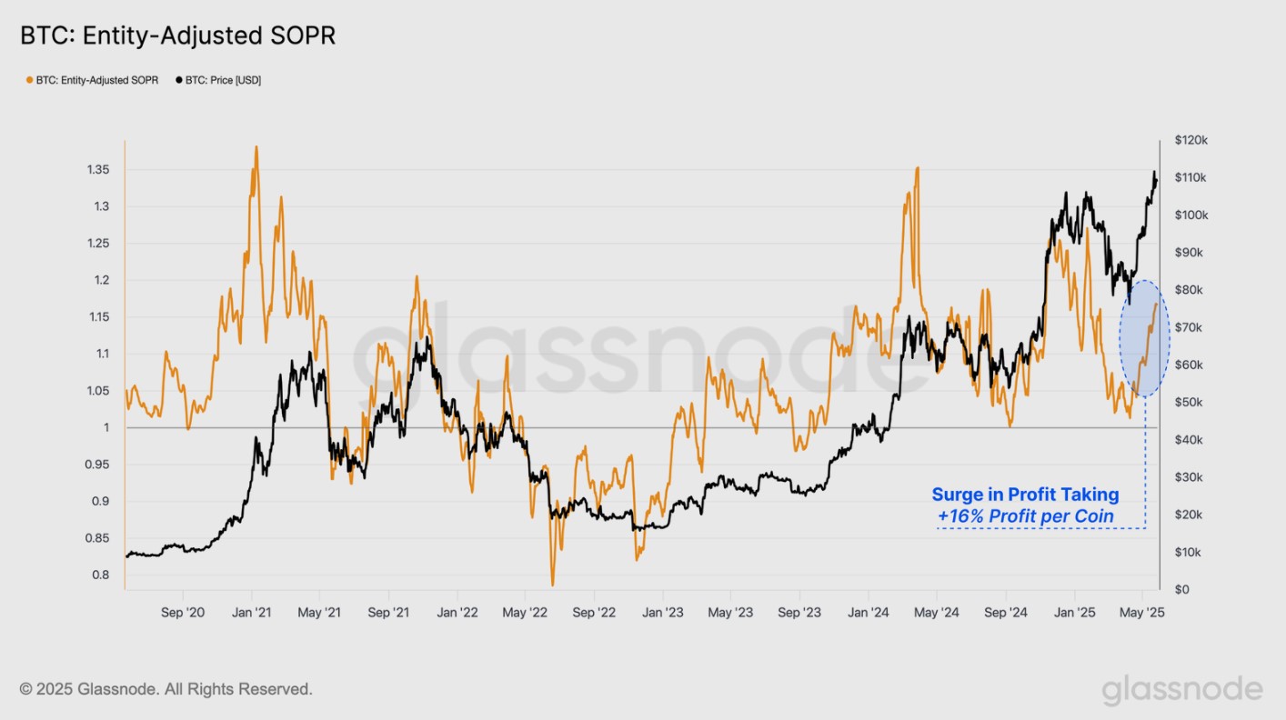 Algo similar refleja la métrica SOPR, mostrada a continuación, que evalúa el múltiplo medio de ganancias o pérdidas bloqueado por los inversores que gastan monedas en la cadena. Según estos datos, la reciente ruptura de ATH llevó un notable aumento en las ganancias bloqueadas, con la moneda promedio capturando una ganancia de +16%.