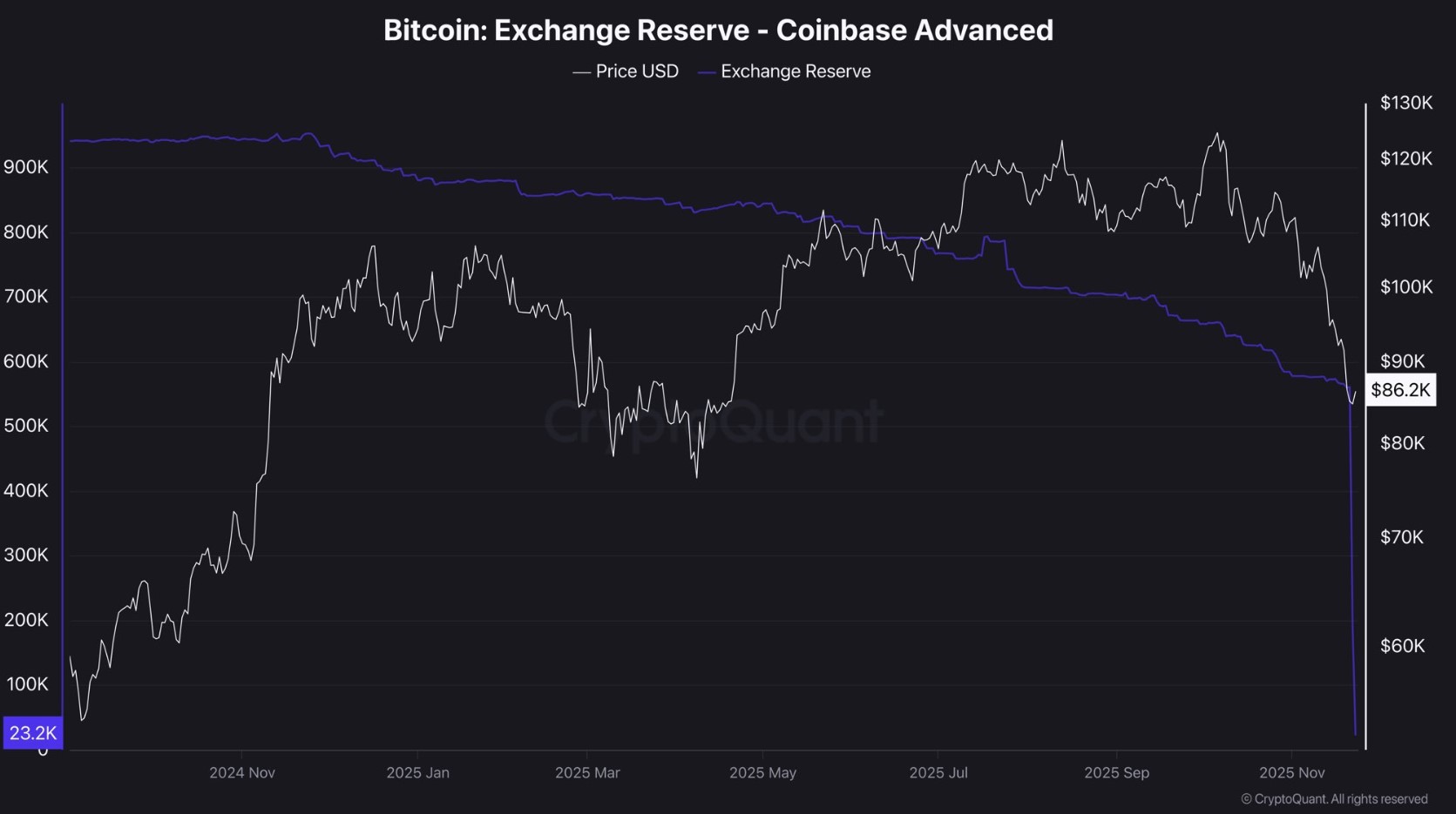 La siguiente gráfica compartida por el analista refleja las reservas de bitcoin del exchange más grande de Estados Unidos. En ella se aprecia un descenso abrupto durante noviembre, sugiriendo que una porción significativa del suministro fue movilizada en un corto lapso.