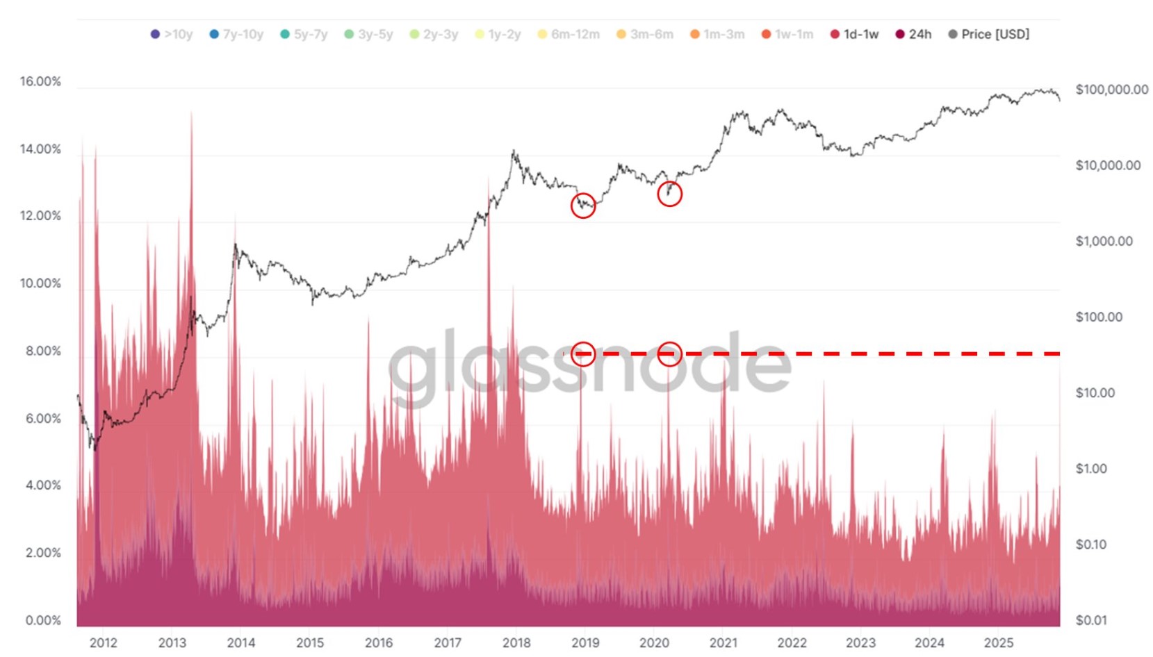 La gráfica de Glassnode a continuación muestra que el cambio de manos reciente de BTC se ubica al nivel de los grandes retrocesos históricos, lo que ha despertado debate entre analistas.