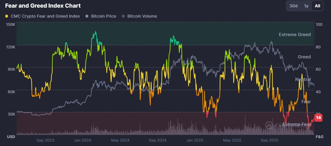 Este nivel refleja un sentimiento de temor extremo entre los participantes del mercado, tras una caída aproximada del 48% desde su pico.