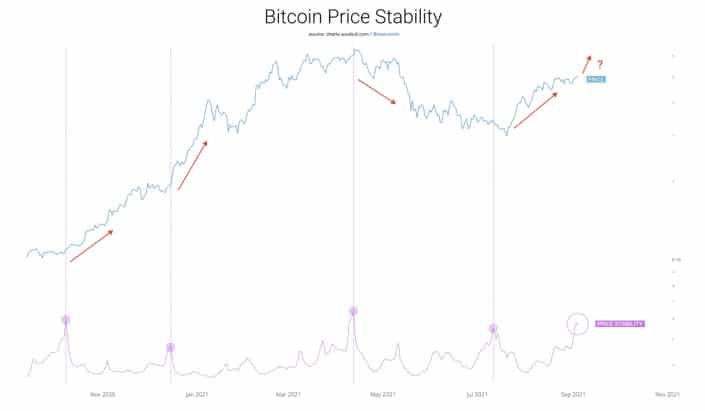 Los datos más recientes a partir de hoy muestran que la estabilidad de precios alcanza un máximo casi histórico. Esto apunta a que una fuga es inminente. Debido al alto pico de estabilidad de precios, se espera que el movimiento de precios posterior sea fuerte.