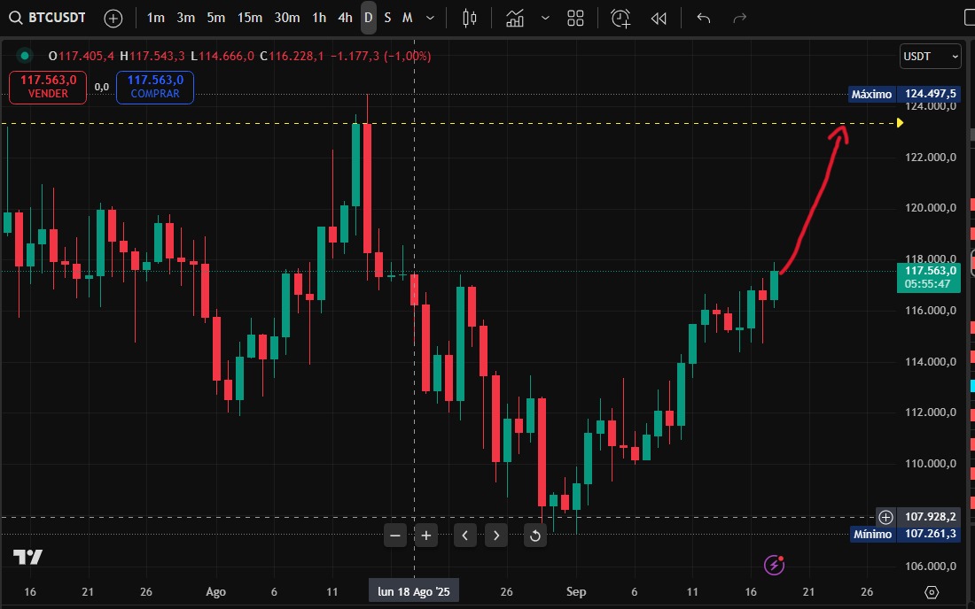 El especialista explica que el activo digital mantiene una tendencia alcista iniciada el 31 de agosto, que ya acumula 18 días, de acuerdo con el gráfico diario del precio. Por lo tanto, no cree que un retroceso por debajo de los USD 115.000 invalide dicho movimiento.