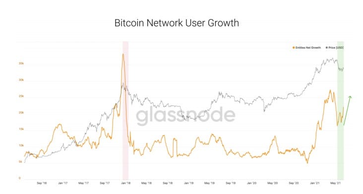 Por ejemplo, datos de Glassnode muestran un incremento de usuarios en la red Bitcoin, algo que apunta a mercados alcistas. «La tasa de crecimiento de usuarios en la red ha estado muy activa, subiendo más alto. Esta imagen disipa los miedos de un mercado bajista oso prolongado. En los mercados bajistas, el crecimiento de usuarios cae por un acantilado», señala la investigación.