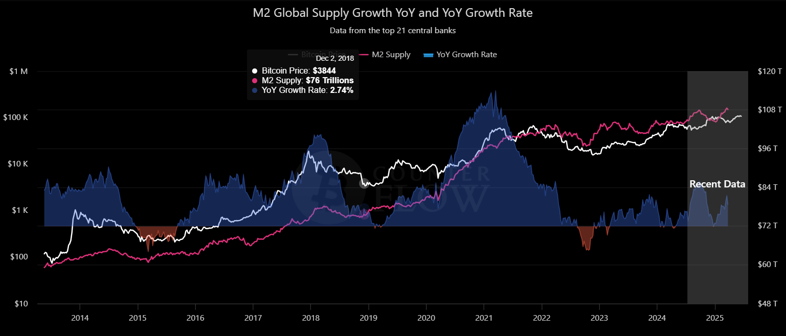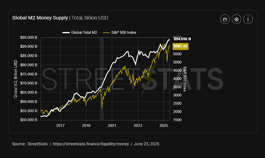 Como reportó CriptoNoticias, Adam Livingston, el autor del libro The Bitcoin Age and The Great Harvest, comentó que la guerra Irán-Israel-EE.UU iba a venir con un aumento de la oferta M2, que históricamente impulsa a BTC al alza, aunque no siguiendo una regla fija: la tendencia correlativa general existe, pero se rompe cada cierto tiempo, como entre septiembre y diciembre del 2016, o desde finales de 2018 hasta mediados de 2019.