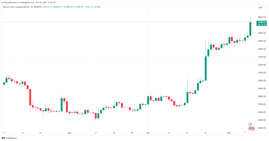 El precio de bitcoin (BTC) experimentó un alza que lo llevó a USD 38.000, su máximo desde mayo de 2022. Esto ocurre luego de permanecer tres semanas alrededor de USD 35.000.