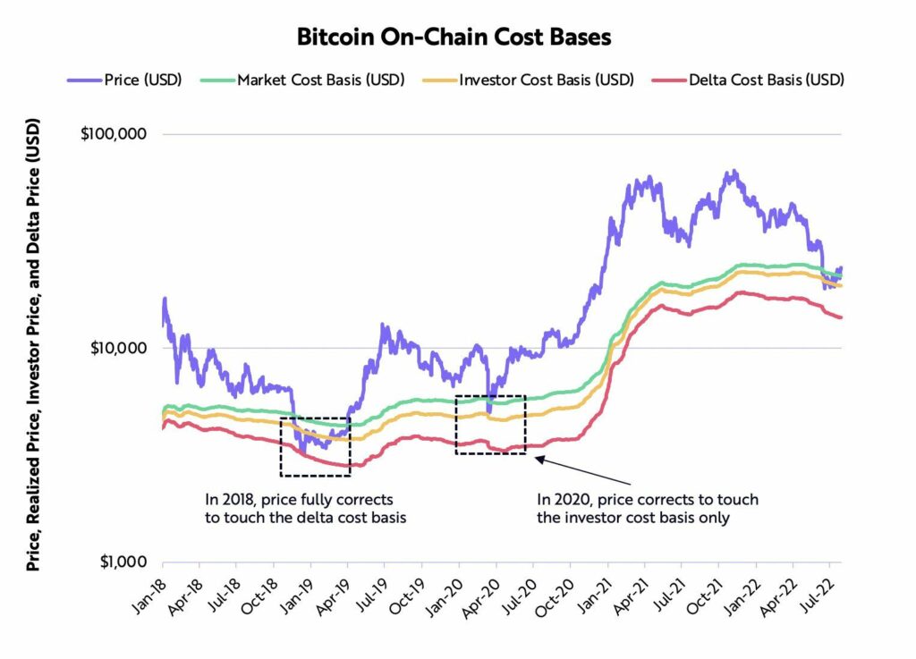 Como se aprecia en el gráfico, en diciembre de 2018 el precio de bitcoin hizo contacto con la curva del costo delta, pero en abril de 2020, el precio en su punto mínimo solo tocó la curva del costo del inversionista. En el ciclo bajista actual, se aprecia que el precio fue por debajo del costo del mercado y del costo del inversionista, antes de repuntar. Sin embargo, en su valor mínimo, el precio se mantuvo muy por encima del costo delta, que es en estos momentos de USD 13.980.