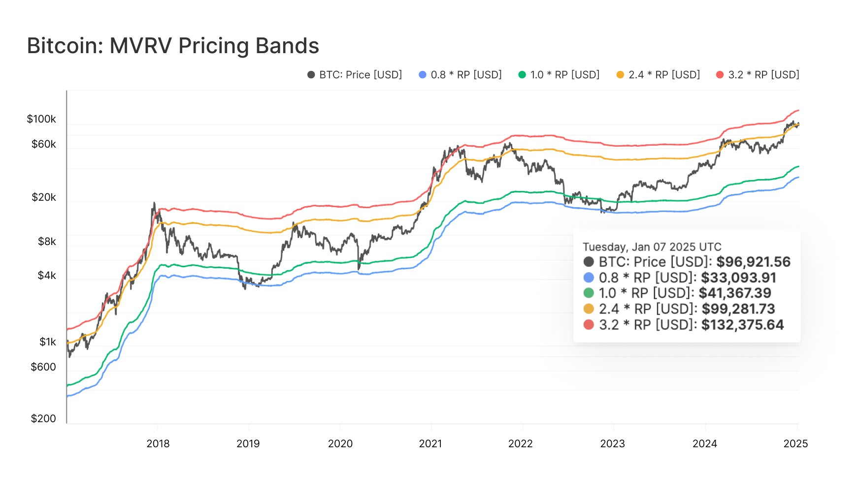 Actualmente, el MVRV está a 2,4, como puede verse en el anterior gráfico. De alcanzar el nivel 3,2 típico del final de ciclo, el precio de bitcoin subiría a USD 132.000, ha resaltado Glassnode, como reportó CriptoNoticias.