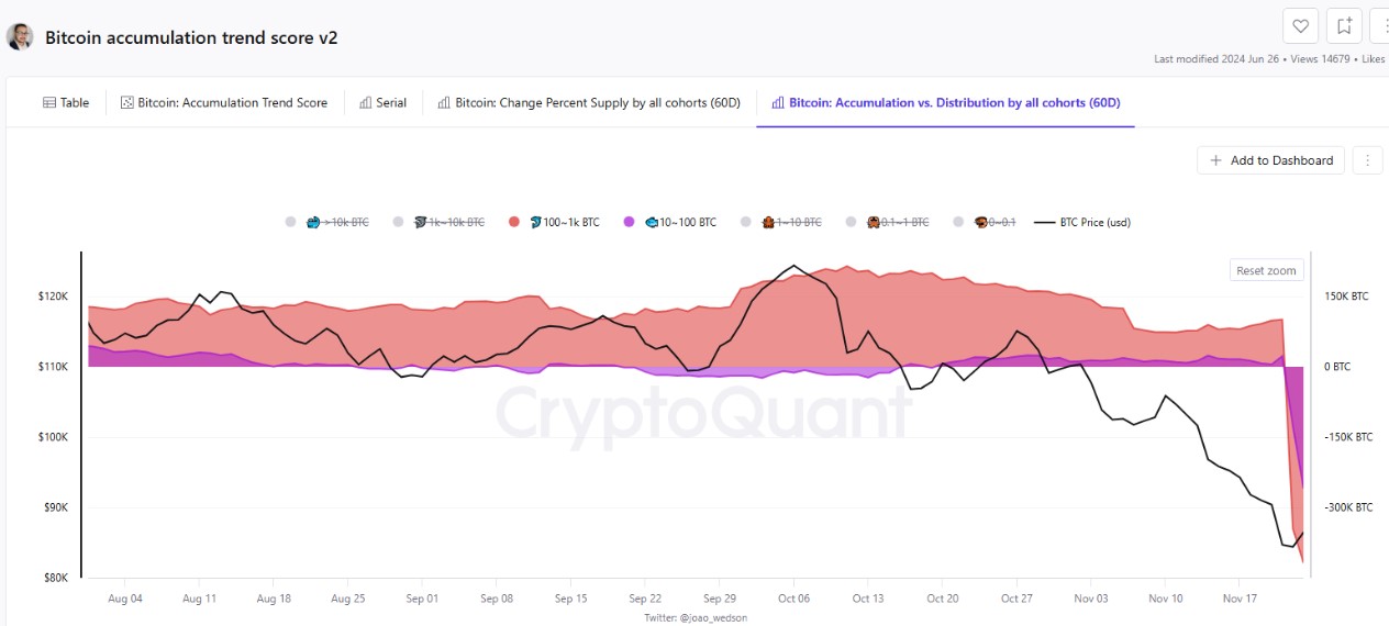 La gráfica de acumulación y distribución por cohortes de CryptoQuant muestra con claridad este comportamiento divergente. En ella se observa que los delfines y tiburones mantuvieron una línea de acumulación estable, representada por la franja rojiza. Esto fue antes de caer bajo cero junto con la corrección de bitcoin, sugiriendo que dejaron de absorber oferta y comenzaron a entregar liquidez al mercado.