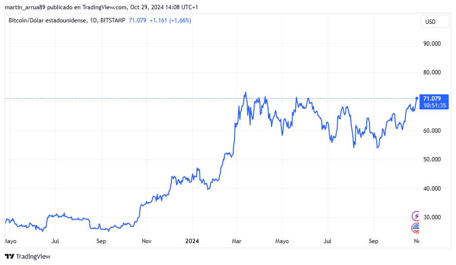 Al momento de publicación de esta nota, el precio de bitcoin en dólares es de 71.079 dólares, tal como se ve en el siguiente gráfico de TradingView.