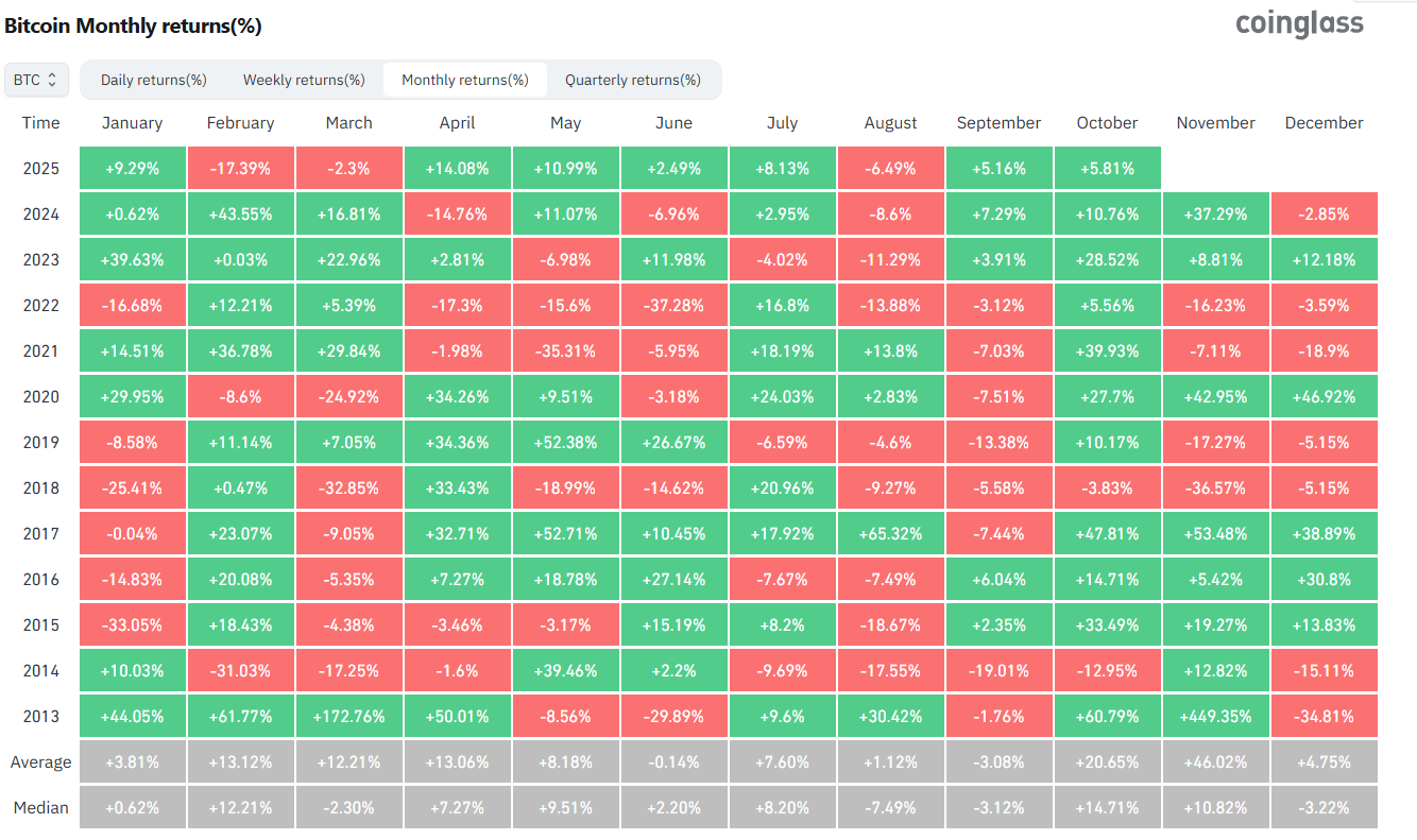 El siguiente gráfico, provisto por Coinglass, muestra el rendimiento histórico de BTC, mes a mes, desde el año 2013: