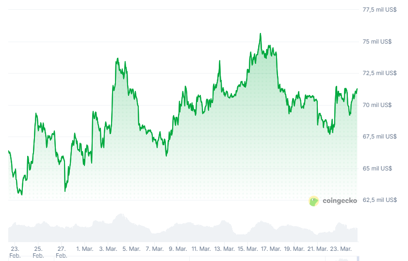 Bitcoin (BTC) cotiza en 71.300 dólares al momento de esta publicación, el miércoles 25 de marzo de 2026.