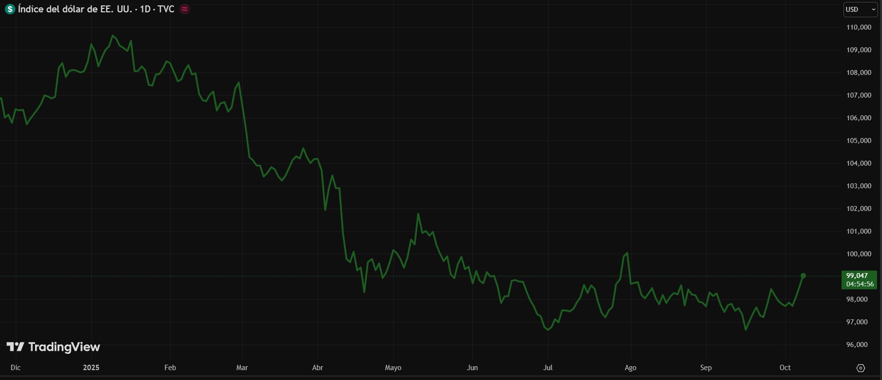 A esto se suma el mal desempeño que ha tenido el dólar estadounidense, que en lo que va de año se ha depreciado en un 10%. El índice dólar (DXY), que mide al billete verde contra una cesta de 6 divisas, como el euro, el yuan y el yen, pasó de 109 puntos en enero de 2025 a los actuales 99 puntos, como se ve en esta gráfica: