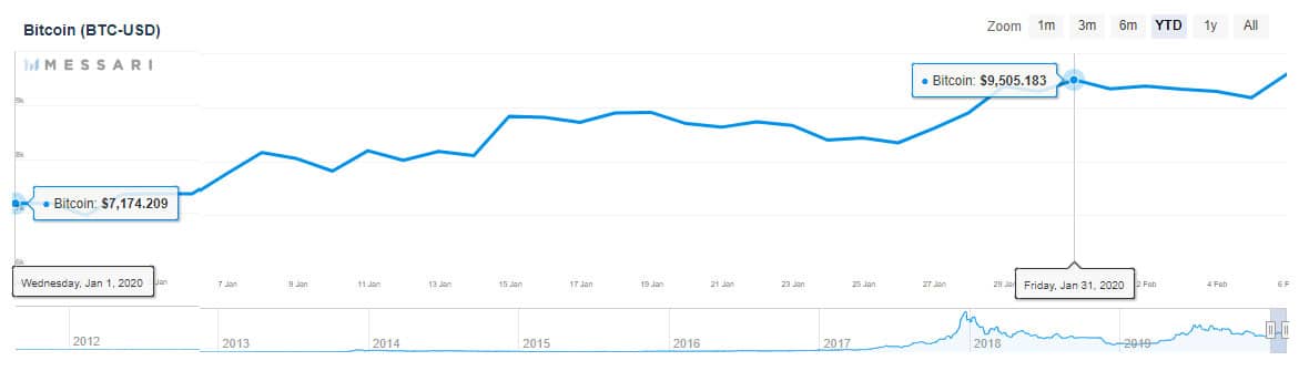 Al comienzo de este año, el 1 de enero, el precio de bitcoin era de USD 7.174, mientras que al último día del mes ya se encontraba en USD 9.505. Así lo reflejan datos de mercado de Messari.