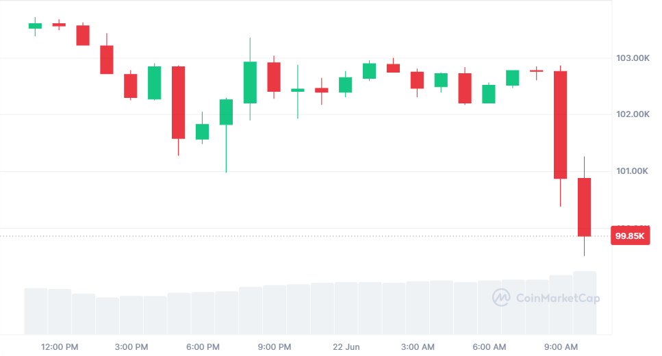 El precio de bitcoin se sitúa ligeramente por debajo de los 100.000 dólares, según datos de CoinMarketCap, en un contexto marcado por la intensificación del conflicto en Medio Oriente.