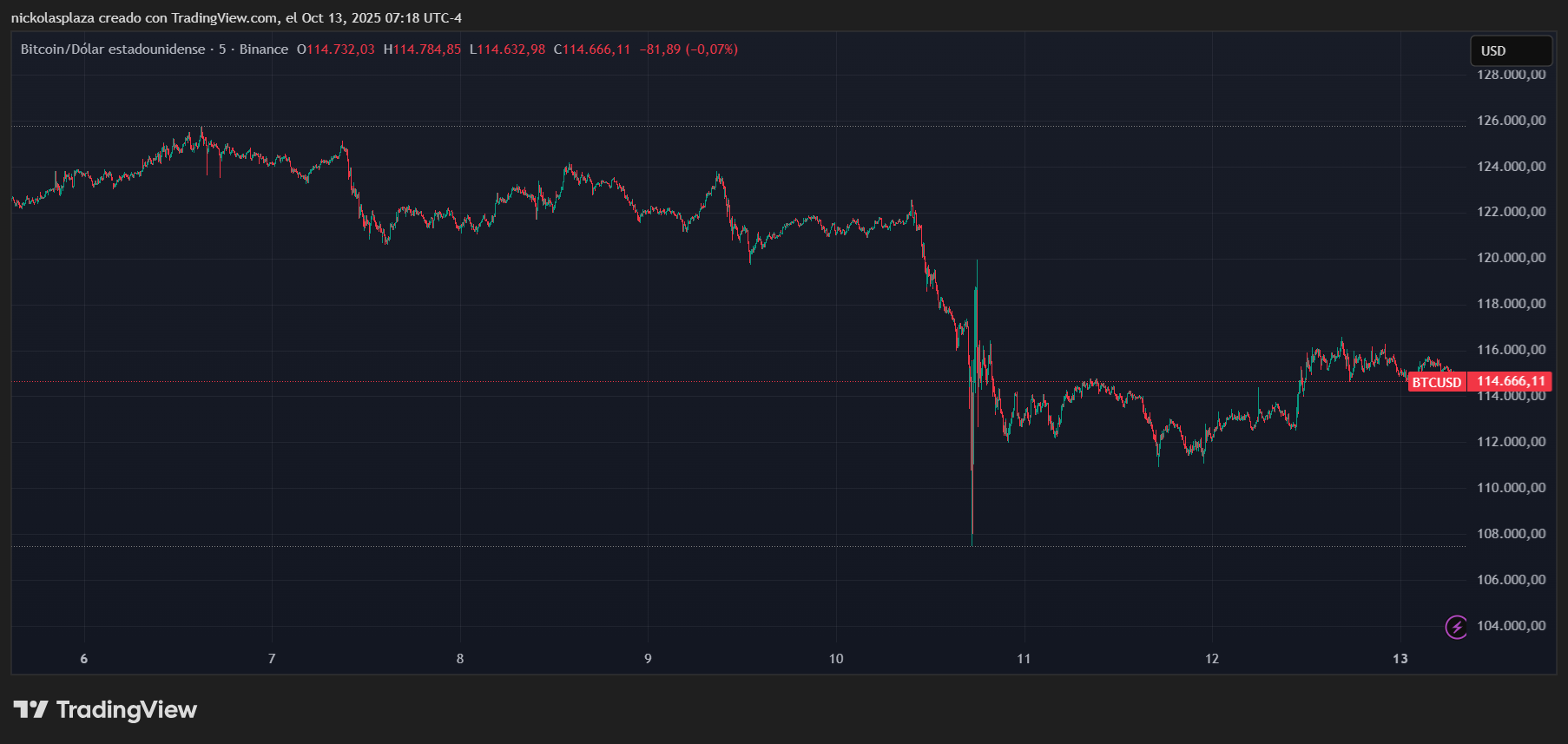 El precio de bitcoin enfrentó volatilidad la semana pasada. Tras alcanzar un nuevo máximo histórico por encima de los 126.000 dólares el lunes 6 de octubre, el activo digital experimentó una corrección el viernes, cayendo hasta niveles cercanos a los 102.000 dólares.