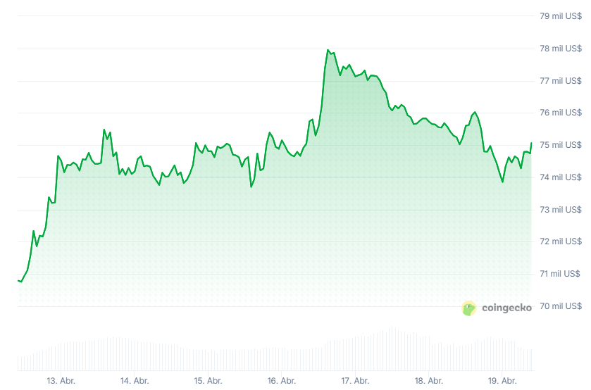 El precio de la moneda digital muestra notable resistencia, manteniéndose por arriba del soporte de 74.000 dólares. Al momento de esta publicación llega incluso a superar los 75.000 dólares.