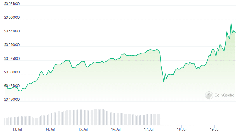 Uno de estos tokens es maker (MKR), que se utiliza para la gobernanza de MakerDAO. En los รบltimos 7 dรญas, como puede verse en el grรกfico a continuaciรณn, tuvo un incremento de precio de casi el 7%. Pasรณ de cotizar USD 909 a USD 976 al momento de esta publicaciรณn.