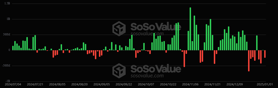 Los fondos cotizados en bolsa (ETF) de bitcoin (BTC) en Estados Unidos reportaron salidas de dinero por más de 242 millones de dólares. Aunque estos instrumentos arrancaron el 2025 con el pie izquierdo, el precio de la moneda digital se mantuvo por encima de los 96.000 dólares.