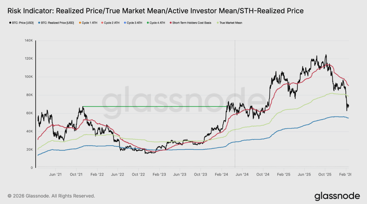 Según el más reciente informe de la firma de análisis Glassnode, publicado este 18 de febrero de 2026, el activo digital ha perdido un soporte crítico al caer por debajo de la media real del mercado (True Market Mean), situada actualmente cerca de los 79.000 dólares.