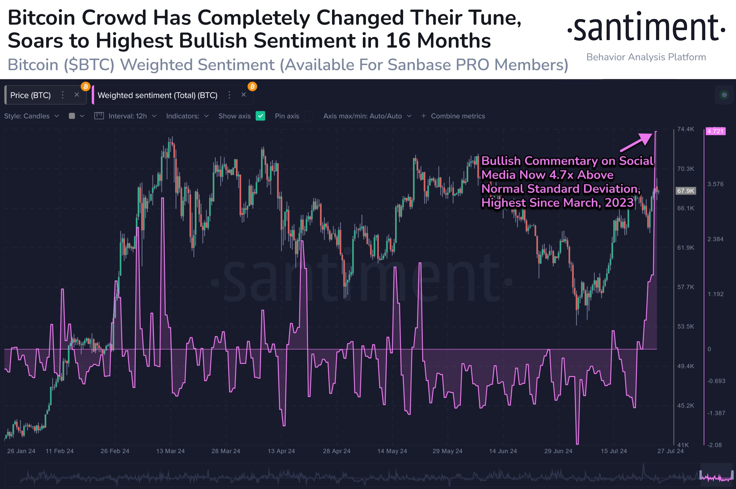 Este planteo surge de los resultados que arrojó el índice de sentimiento ponderado, el cual mide las menciones de “Bitcoin” en la red social X y compara la proporción de comentarios positivos y negativos. “La proporción de comentarios positivos y negativos hacia BTC se ha lanzado a su nivel más alto desde marzo de 2023, ya que un máximo histórico vuelve a estar en los radares”, agrega Santiment.