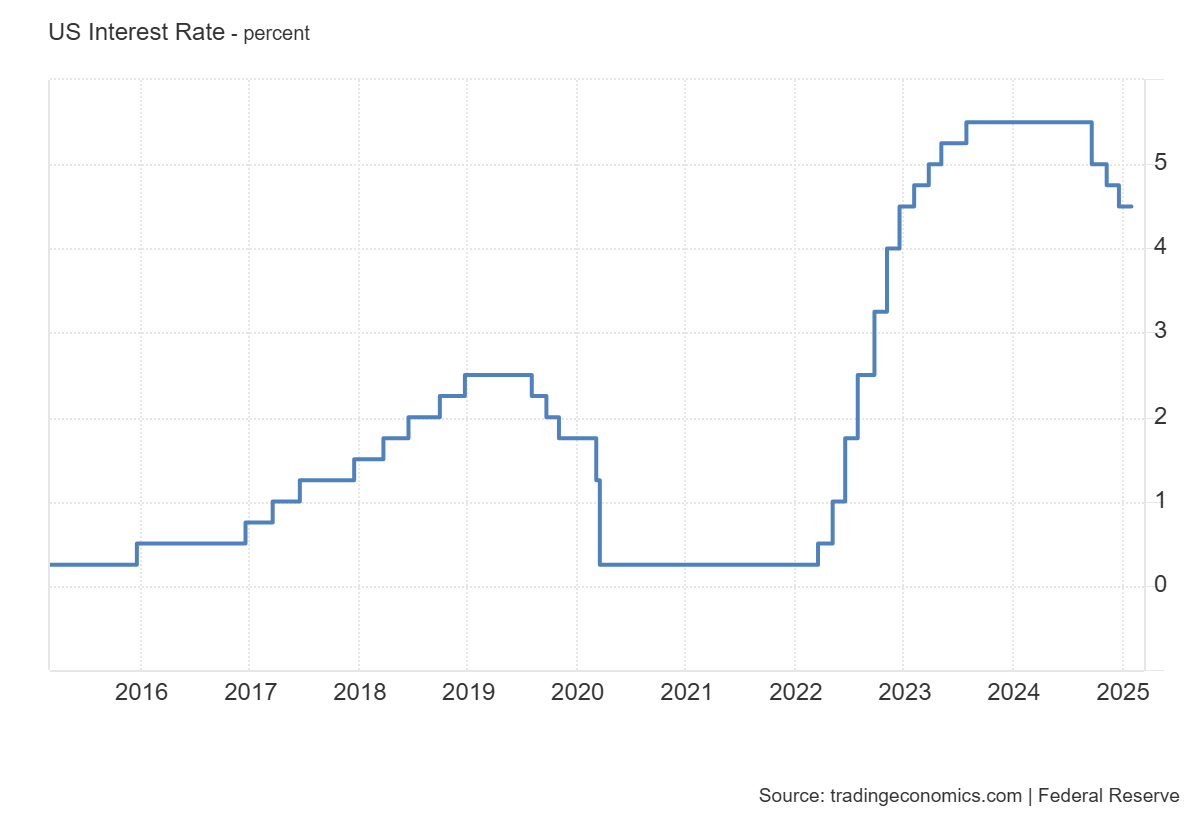 Adicional a ello, considera que el problema que están enfrentando hoy en día las criptomonedas es que la tasa de interés de Estados Unidos y el mundo está alta. Esto se diferencia del ciclo alcista anterior, ocurrido en el año 2021, cuando estaba baja para rescatar la economía del golpe de la pandemia, como se ve a continuación.