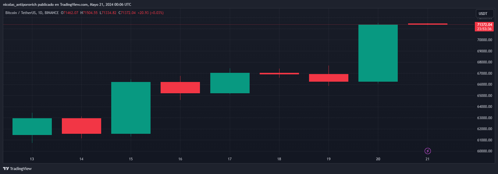El precio de bitcoin (BTC) se dispara por arriba de los 71.000 dólares, un nivel que no se veía desde el 15 de marzo de 2024.