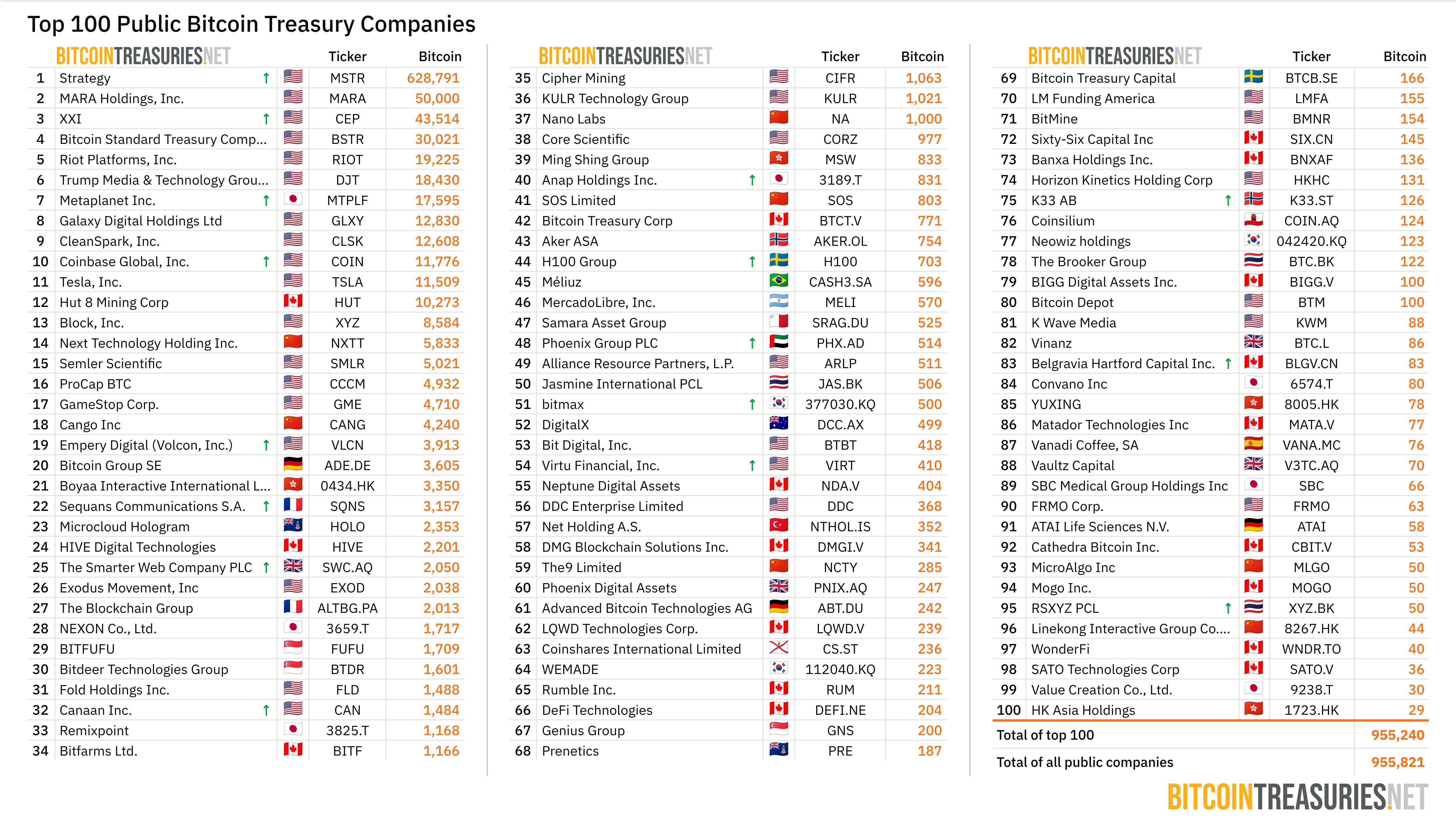 Mientras los antiguos poseedores venden, las instituciones compran sin pausa. Actualmente, 162 empresas de cotización públicas globales incluyen bitcoin en sus balances, acumulando 955.240 BTC.