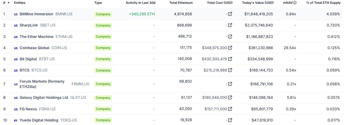 Bitmine es la empresa de cotizaciรณn pรบblica con mรกs ether (ETH) en su poder.