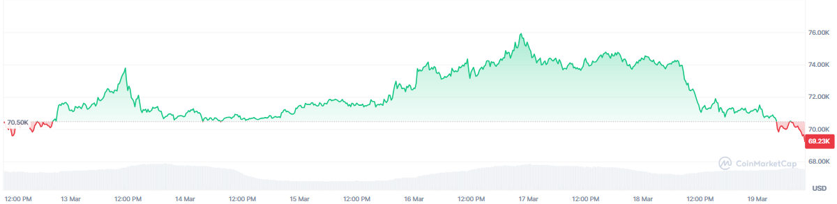En el caso de la moneda digital, su cotización volvió a caer por debajo de los 70.000 dólares, tal como se observa en el siguiente gráfico: