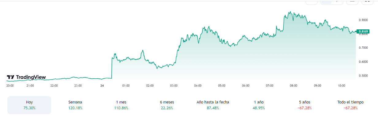 Con un aumento de precio que superó el 100% en un día, el token del protocolo Mina (MINA) se cotizó en más de USD 0,90 durante las primeras horas de este 24 de octubre. Esto, tras haber mantenido un valor estable que había estado rondando los USD 0,30 y USD 0,40 en el último mes.