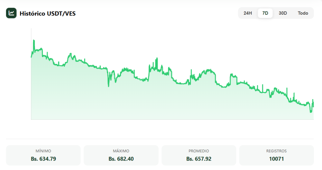 El precio de USDT en Venezuela ha caรญdo mรกs de 6,5% en los รบltimos 7 dรญas. En ese perรญodo, pasรณ de 682 bolรญvares (moneda nacional venezolana) por USDT el pasado 28 de marzo a rondar los 634 al momento de redacciรณn de este artรญculo, la maรฑana de este sรกbado 4 abril.