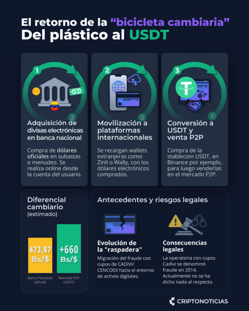 Esta caรญda en la cotizaciรณn de USDT ha impactado directamente en lo que se conoce popularmente como la ยซbicicleta cambiariaยป, un fenรณmeno que aprovecha la disparidad entre las distintas tasas de cambio que conviven en la economรญa venezolana.