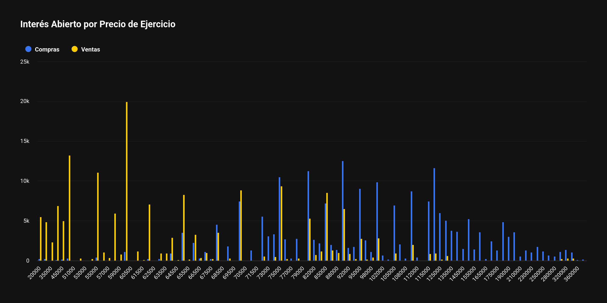 La declaración se produce en un contexto en el que la opción de venta en 60.000 dólares acumula alrededor de 1.500 millones de dólares en interés abierto. Se trata del mayor volumen registrado entre todos los precios de ejercicio y vencimientos en la plataforma, como exhibe el siguiente gráfico.