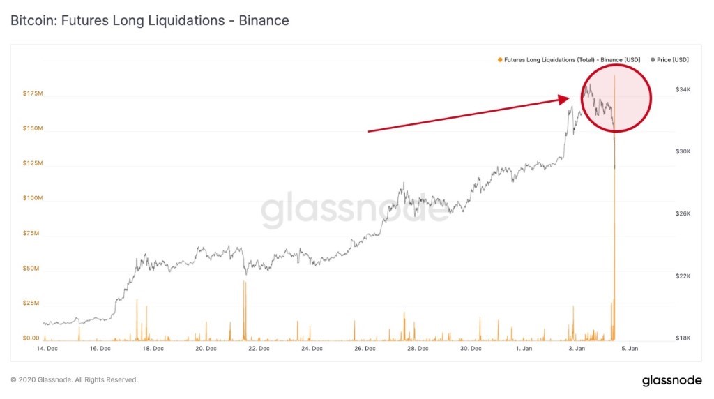 La cifra, ocasionada por la breve caída del precio este lunes 4 de enero, representa un récord de liquidaciones en un período tan corto, según datos de la firma de análisis Glassnode. De hecho, en la gráfica de esta empresa para las liquidaciones en Binance, se ve un pico anterior apenas por debajo de los 50 millones de dólares.