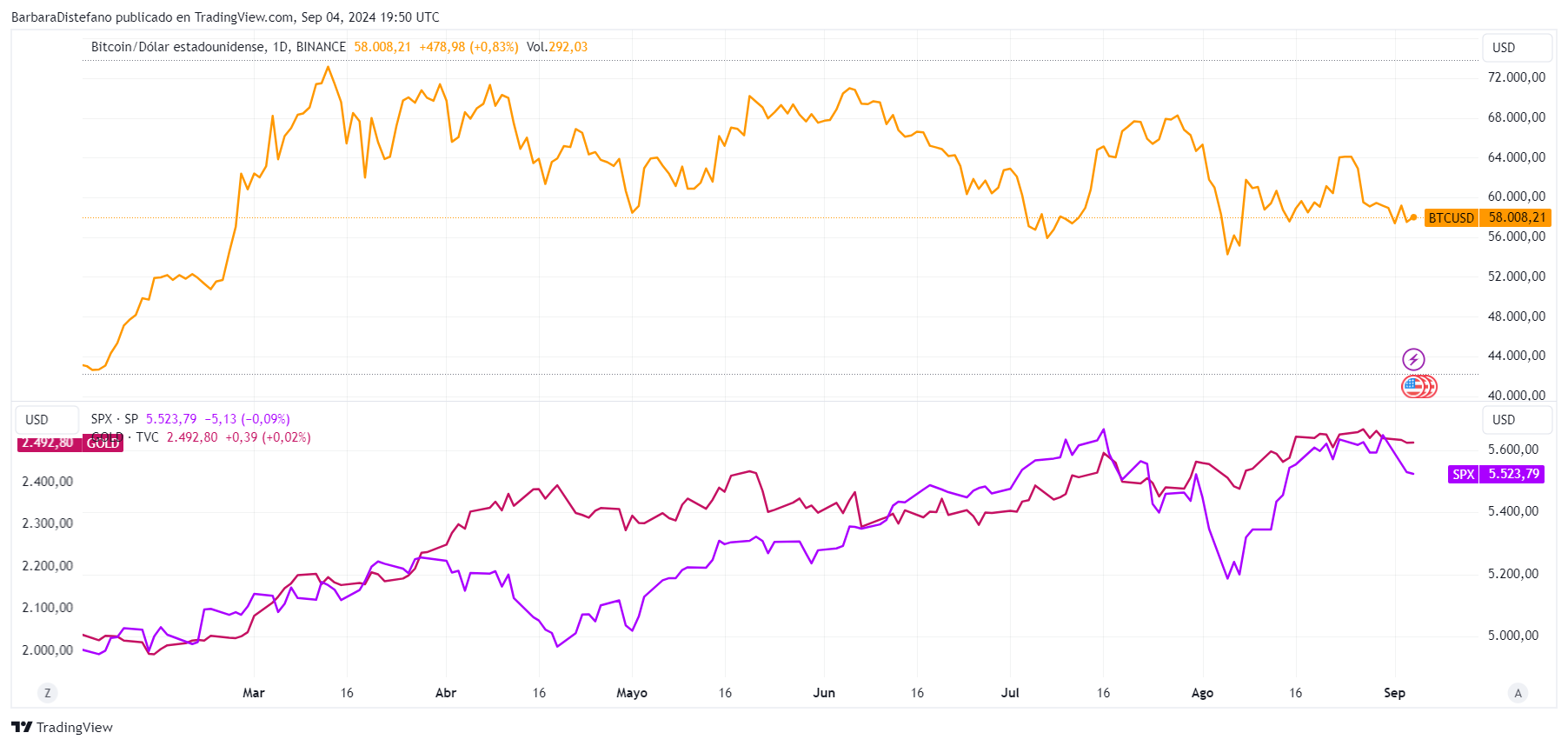 En contraste, como se ve a continuación, bitcoin cotiza a 20% del máximo histórico de 73.700 dólares (USD) que marcó hace seis meses. Aunque, lejos de resultar esto en debilidad para el mercado, sigue siendo el claro ganador del último año si se compara con el oro y las principales acciones.