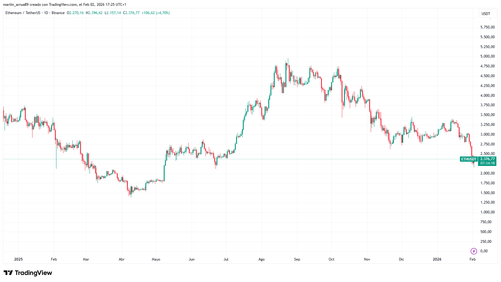 Al momento de la publicación de esta nota, ETH se negocia en 2.367 dólares, un 52% por debajo de su máximo histórico de 4.953 dólares, según cálculos realizados con la calculadora de CriptoNoticias: