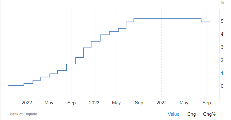 El Banco de Inglaterra resolvió este jueves mantener la tasa de interés en 5%.
