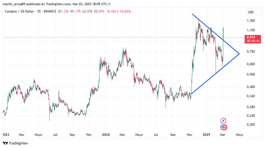 En el gráfico anterior, se puede observar que el precio de ADA pasó de 0,64 dólares a 1,10 dólares, lo que se interpreta como la resolución del triángulo.