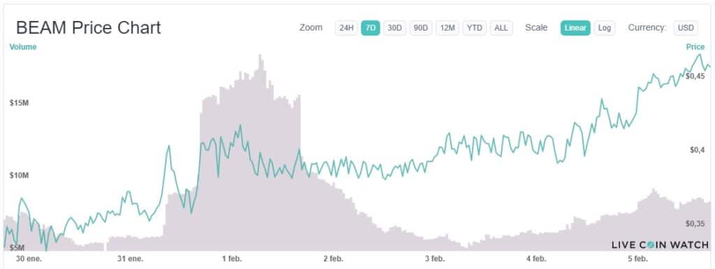 Este 5 de febrero, el precio de BEAM llegรณ a un pico de USD 0,47. La capitalizaciรณn de mercado es de USD 38,1 millones y el volumen de comercio en 24 horas es de 8,2 millones de dรณlares.