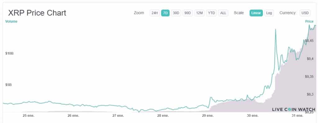 En este contexto, el precio de XRP alcanza su valor mรกs alto en lo que va del aรฑo, con una cotizaciรณn de USD 0,743 para el 2 de febrero. De esta forma, XRP supera el mรกximo que tenรญa a principios del mes de diciembre, poco antes de que la Comisiรณn de Bolsa y Valores de Estados Unidos (SEC) demandara a Ripple, acusรกndola de llevar a cabo una oferta ilegal de valores.