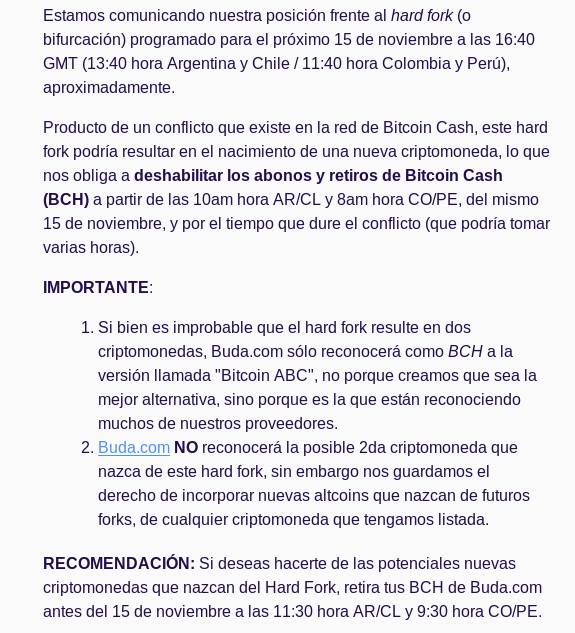 Asimismo, la casa de cambio confirmó que deshabilitará los depósitos y retiros de Bitcoin Cash desde el próximo 15 de noviembre —fecha en que se realizará el hardfork—, así como también quedará vedada cualquier actividad de compra-venta hasta nuevo aviso.