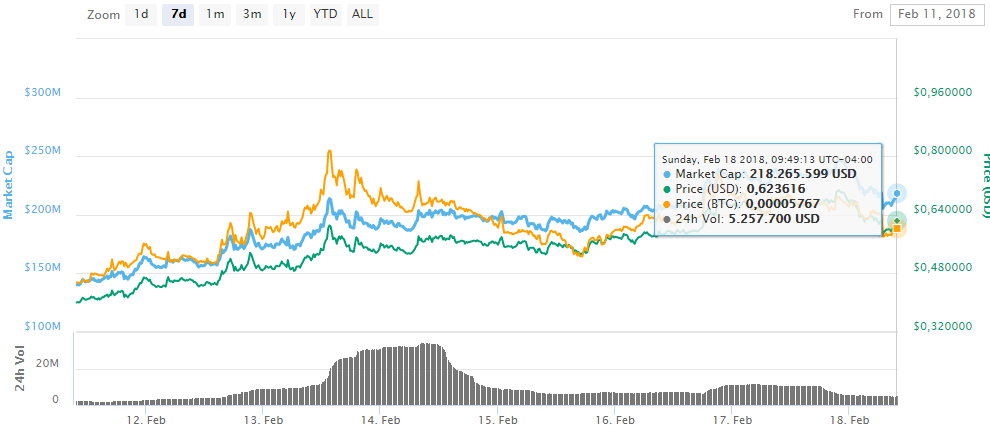 Durante la última semana su valor pasó de $0,74 a $1,17, un aumento de 57%. Su punto más alto en este tiempo fue el 14 de febrero, que llegó a valer 1,22 dólares. La razón, igual que en el caso de ChainLink, fue la aparición de un artículo sobre la plataforma en The Merkle, un importante portal de noticias relacionadas con el ecosistema blockchain.