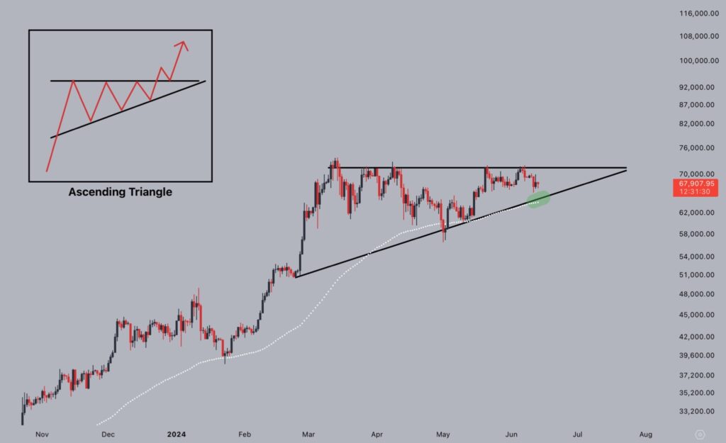 “Las caídas son para comprar”, consideró el trader de seudónimo Jelle mientras siga esta estructura de triangulo ascendente. Actualmente, BTC cotiza a 8% de su máximo histórico de USD 73.700 registrado hace tres meses.