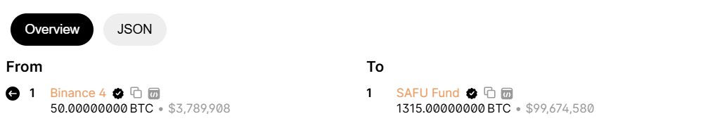 Los datos on-chain muestran que la transferencia de los fondos se hizo desde una wallet etiquetada como Binance hacia una dirección asociada al fondo SAFU, como se ve a continuación: