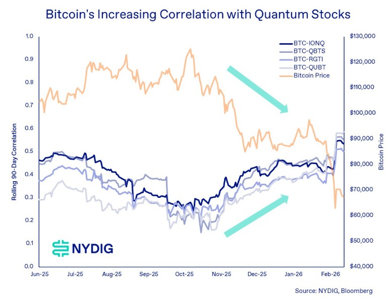 Estas correlaciones se han fortalecido durante la reciente ola de ventas. “Si los avances cuánticos estuvieran erosionando la confianza en bitcoin, esperaríamos la dinámica opuesta”, expresa NYDIG. Es decir, una apreciación de las acciones cuánticas mientras bitcoin se deprecia.