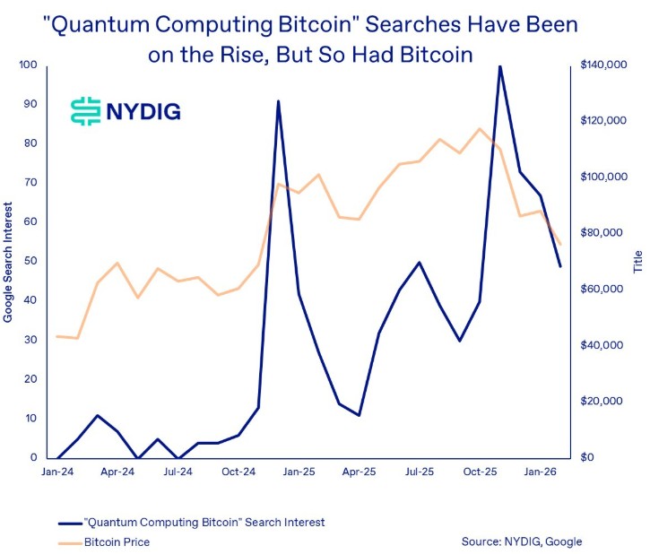 Entre las evidencias presentadas, la empresa que se especializa en custodia de bitcoin y criptomonedas señala que el aumento en las búsquedas de Google sobre “computación cuántica Bitcoin” se produjo en paralelo con el repunte del precio hacia máximos históricos previos. Pero no ocurrió lo mismo durante la debilidad sostenida del precio de bitcoin que ha caído 29% en el último mes.