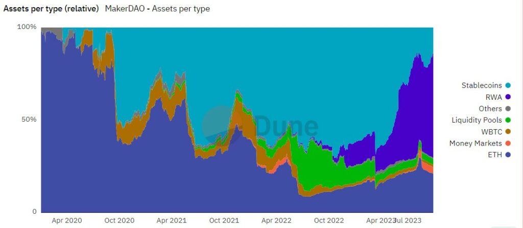 “MakerDAO ha surfeado perfectamente la ola RWA, y su enfoque adaptativo le ha permitido no solo mantener su dominio sino multiplicar sus ventajas”, dice. Por eso, cree que el ecosistema se ha adaptado mejor que la mayoría al entorno actual, evolucionando en el tiempo desde los días en que la garantía de DAI era principalmente en ether (ETH).